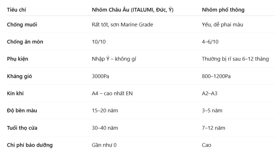 → Rõ ràng, với môi trường biển chỉ nhôm Châu Âu mới thực sự bền bỉ.