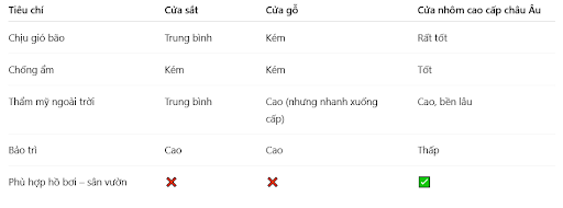 Bảng so sánh cho thấy cửa nhôm cao cấp châu Âu là lựa chọn tối ưu cho các không gian ngoài trời yêu cầu độ bền và thẩm mỹ lâu dài.