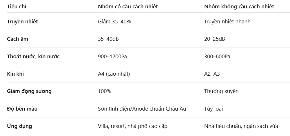 - Nhôm có cầu cách nhiệt giảm truyền nhiệt 30–40%, không làm tường, vách hay tay nắm nóng lên.