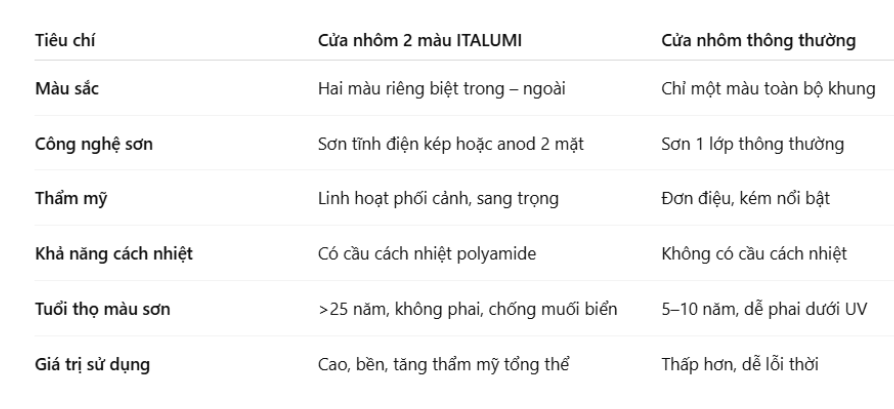 6. So sánh cửa nhôm 2 màu ITALUMI với cửa nhôm thông thường