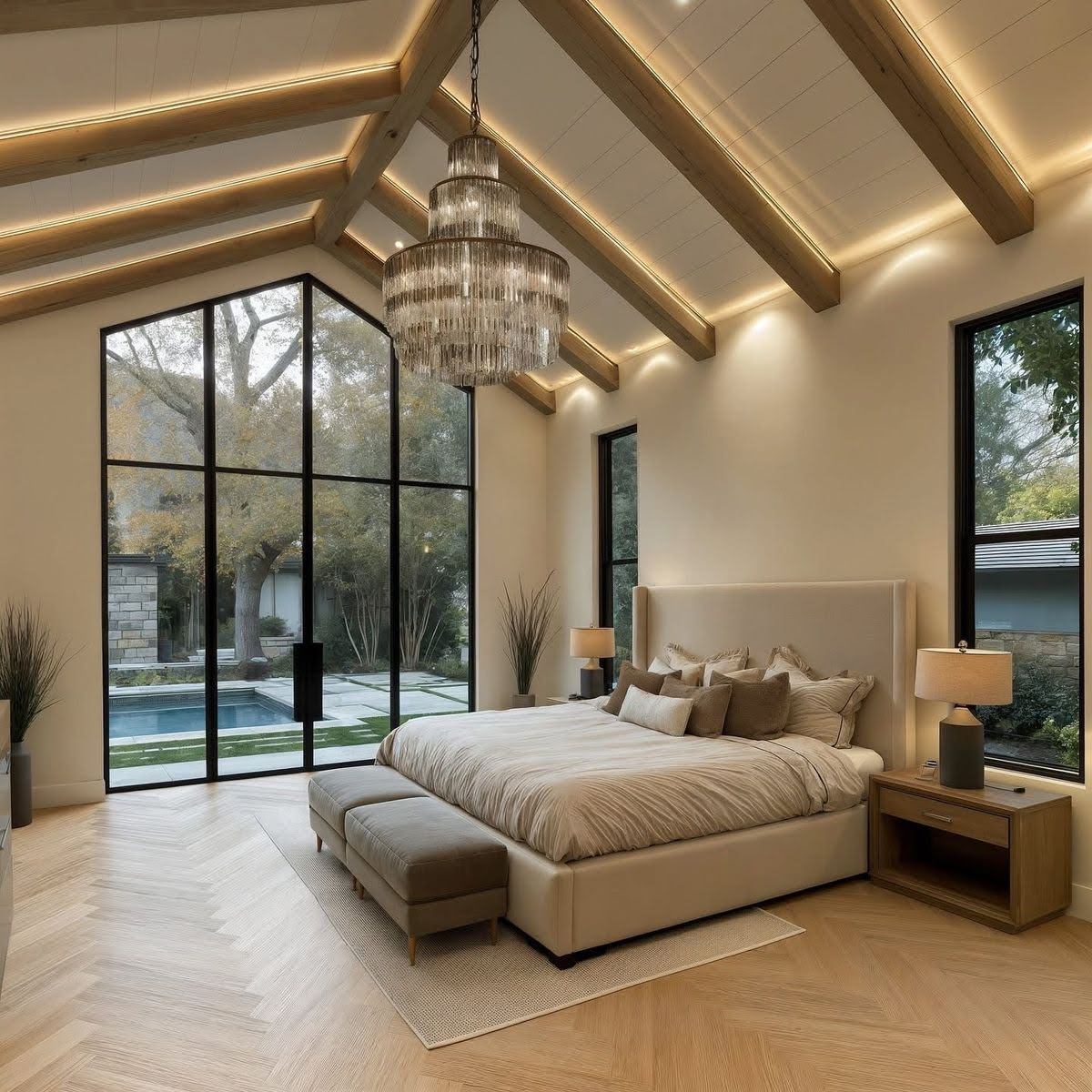 Với villa hoặc căn hộ cao cấp, cửa nhôm phòng ngủ thường được thiết kế cao sát trần để tạo cảm giác không gian rộng hơn. Khi kết hợp cùng rèm hai lớp, vừa đảm bảo riêng tư vừa tối ưu ánh sáng tự nhiên.