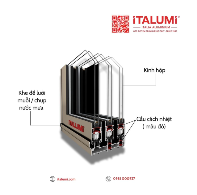 - Hệ cầu cách nhiệt C60, C70, S84, S110 của ITALUMI có chỉ số cách âm lên đến 40dB, cách nhiệt chỉ 1.5 W/m²K, giúp không gian trong nhà luôn yên tĩnh và mát mẻ.